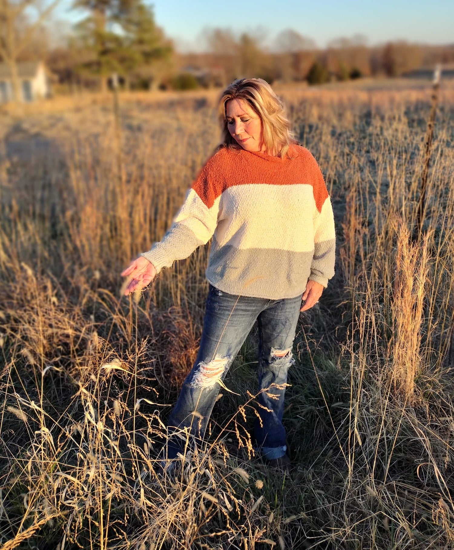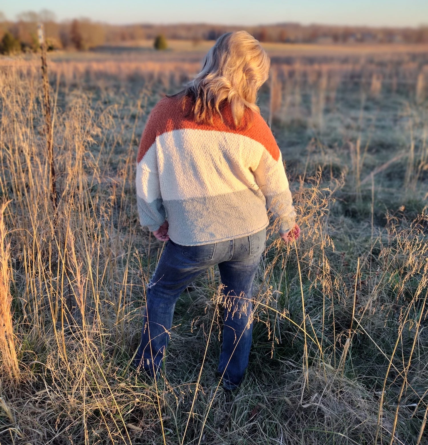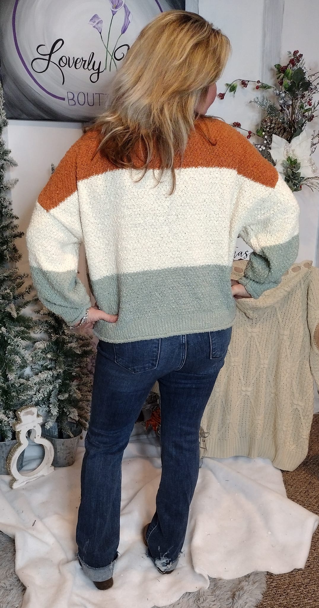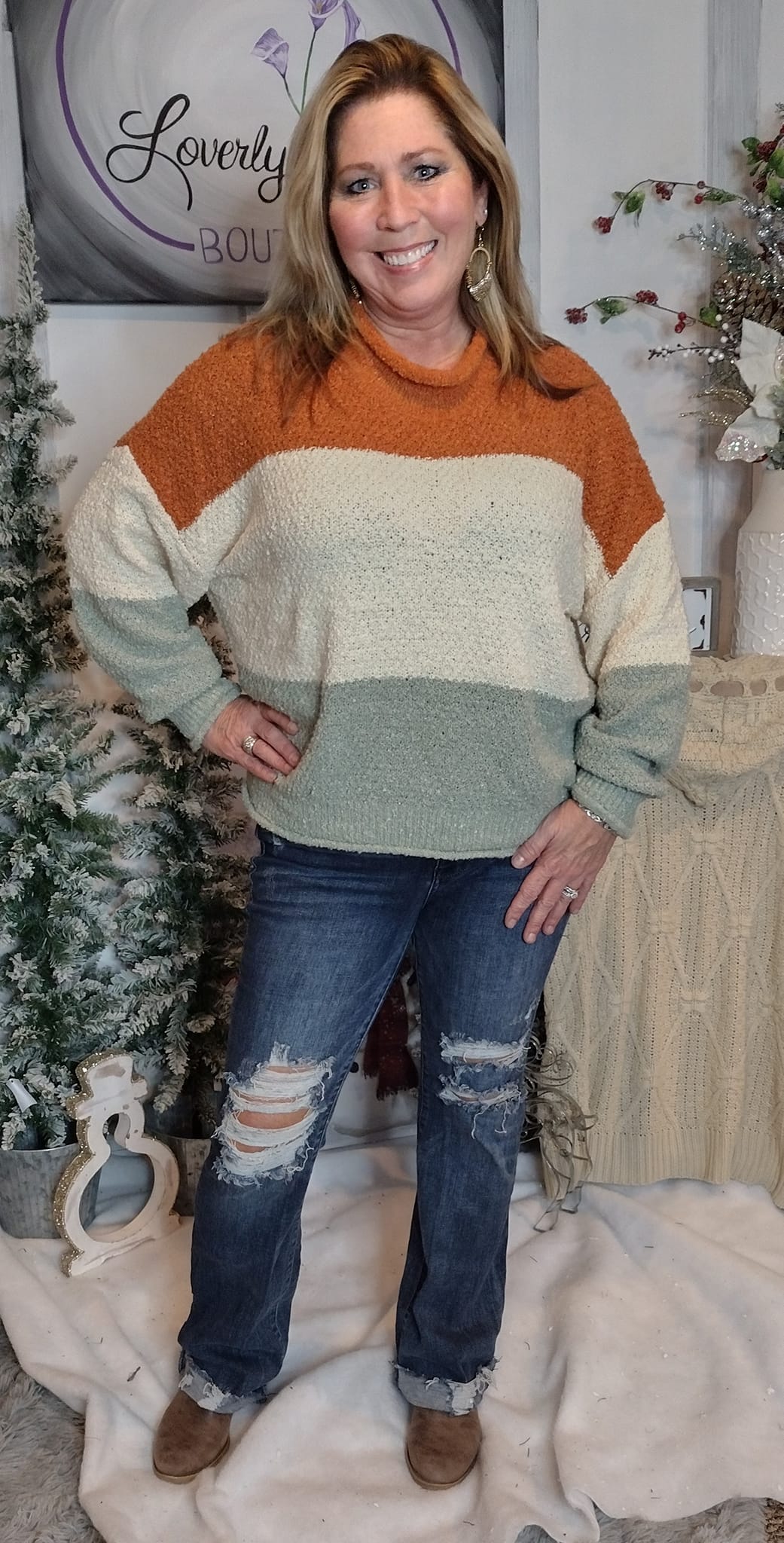 Loose Fit High Neck Color Block Sweater. Rust/Ivory/Sage