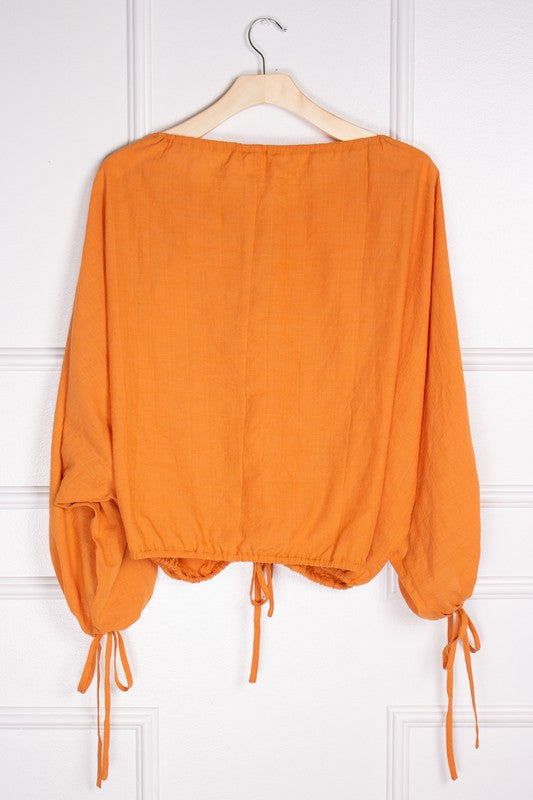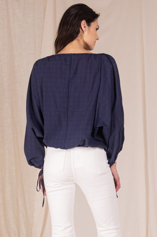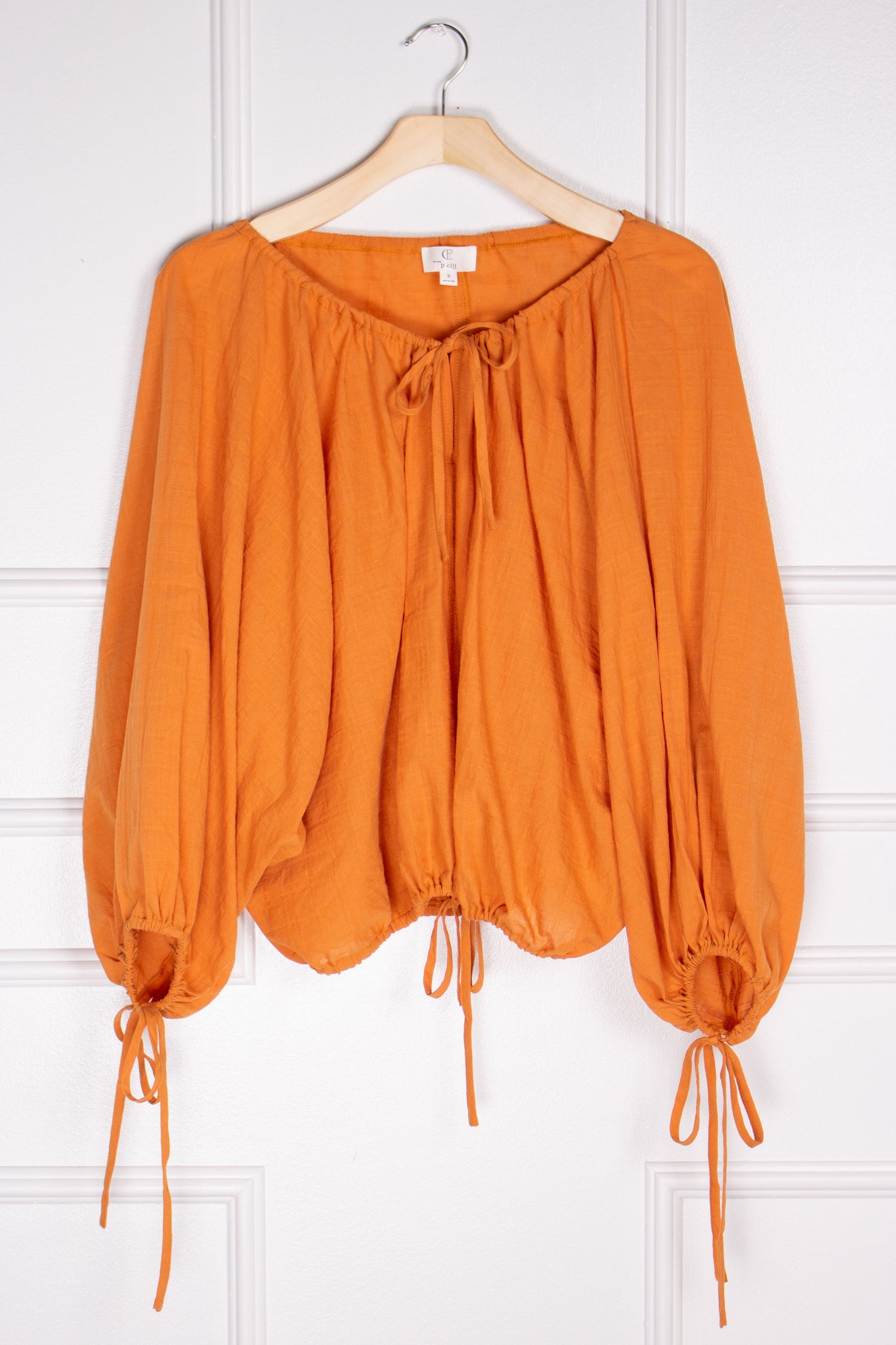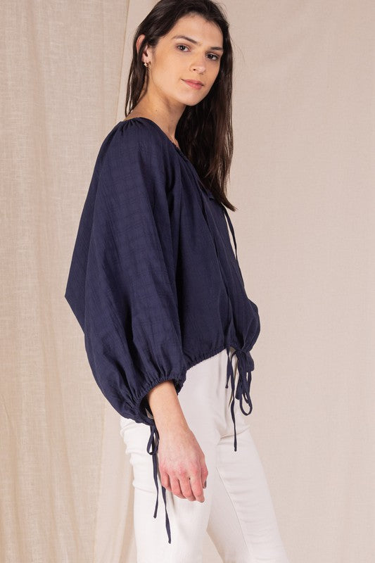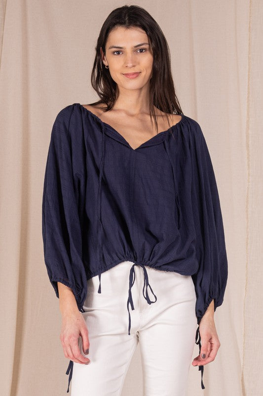Details: - Cotton fabrication - Tying front keyhole - Billowy fit - Balloon sleeve - V neckline - Cinched hem with tie Billowy fit cotton blouse with cinched hem.