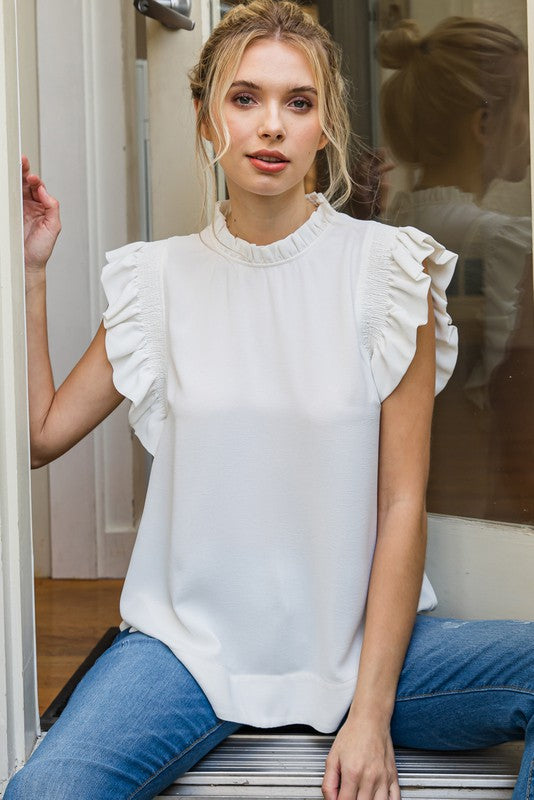 Solid top with a frill smock neckline and smocked ruffle cap sleeves. Unlined, no-sheer, and lightweight.