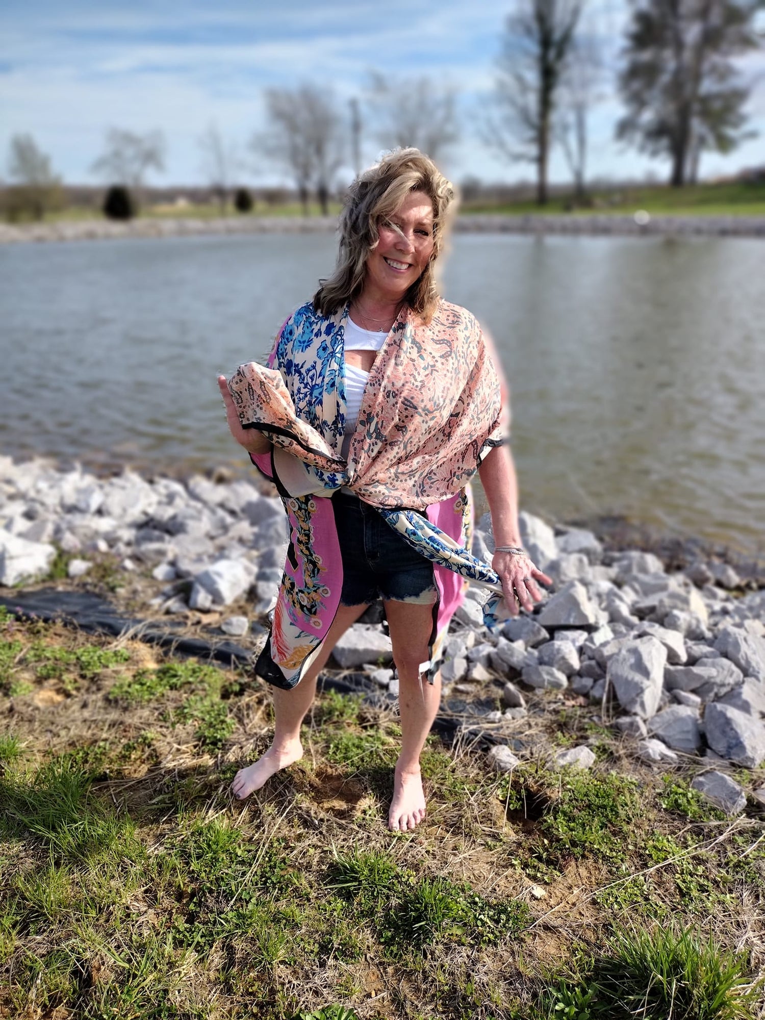 Cool, Flowy and Colorful Kimono. Perfect for anything from a Girl's Day Out to Dinner to a day on the Beach. One size fits all - Patch Print - 100% Viscose