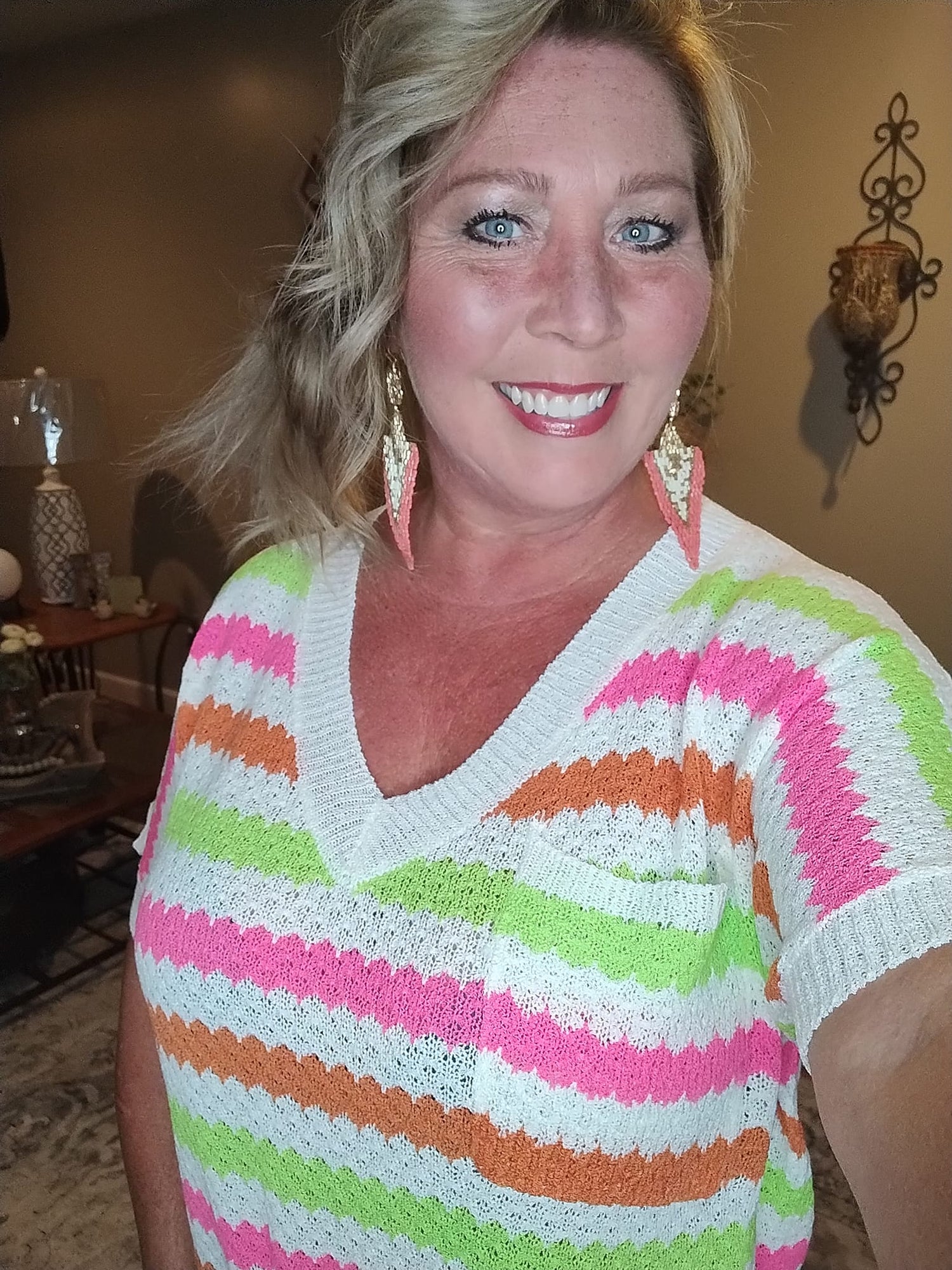 Feeling Bright is the perfect light weight sweater knit top. Your gonna stand out with with the vibrant green, pink and orange colors in this top. Relaxed fit with side slits for extra comfort.