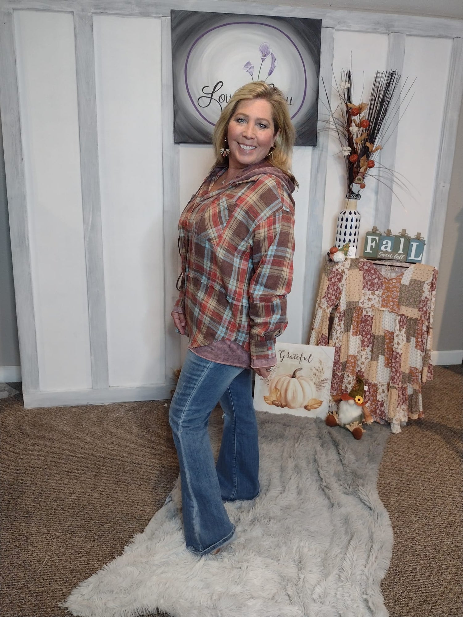 Multi color checkered button down hoodie with chest pockets.