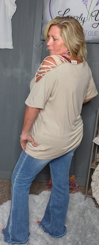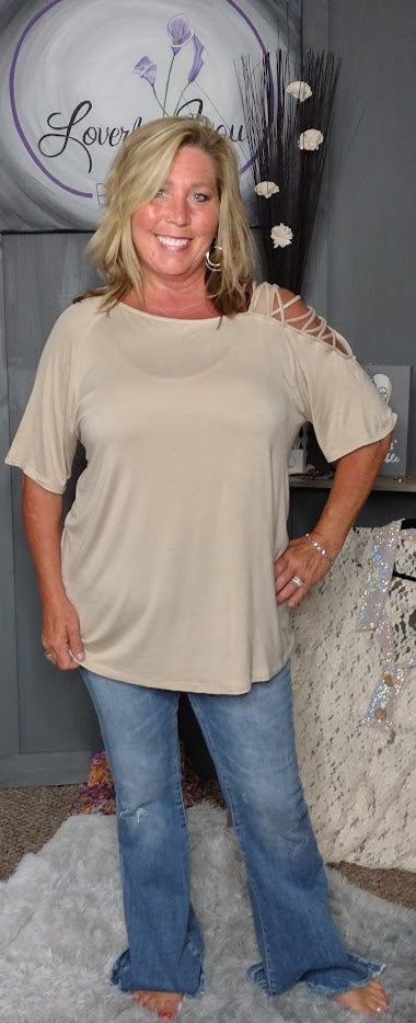 Jersey Knit Top With Open Shoulder and Strap Detail. This top can be worn anywhere on any occasion. Cool, Classy and Comfortable!