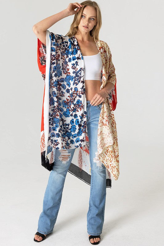 We absolutely love Kimonos! This is a Boho print kimono with contrasting prints. Ultra light, draping open-front. Light and billowy silhouette, perfect for effortless layering.