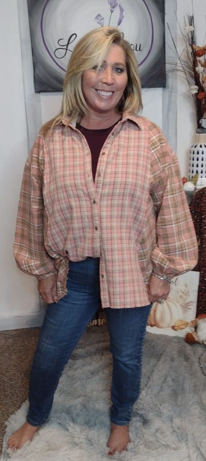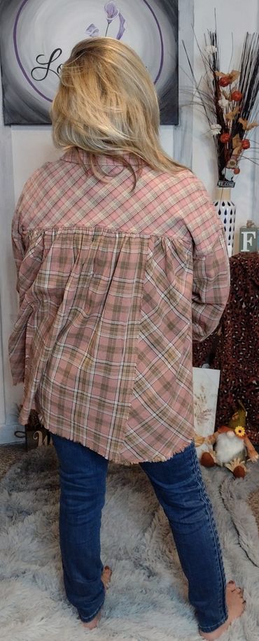 You want comfort, well you will have it with Millie. Millie is a very lightweight flannel type material. Millie is a Mix Patterned plaid top with pleating across shoulder in back.