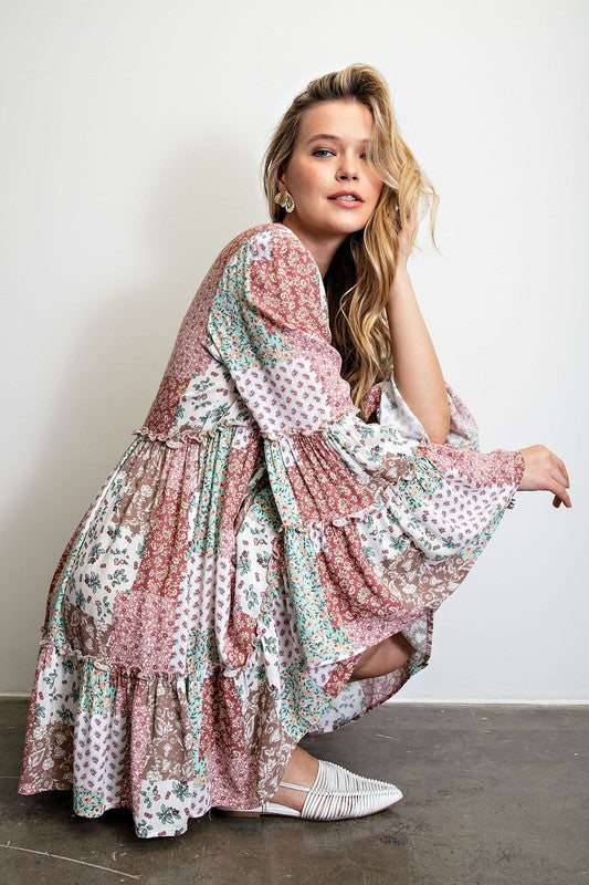 Rayon Gauze Midi Dress - V Neckline - Bell Sleeves - Ruffled Bottom Him - FLowy and Pleated Silhouette. Relaxed and Loose Fit. Multi Print and Color Blocked Design.