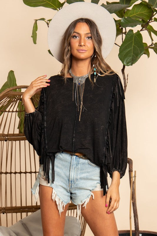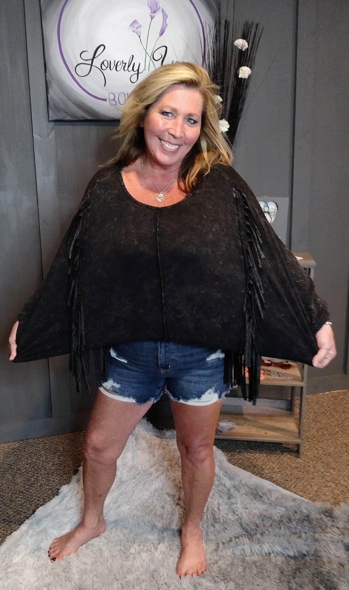 This is a fun top. Soft to the touch and very comfy with a little fringe pizazz. The mineral wash gives it a slight worn, and unique look. Relaxed fit. Can size down.