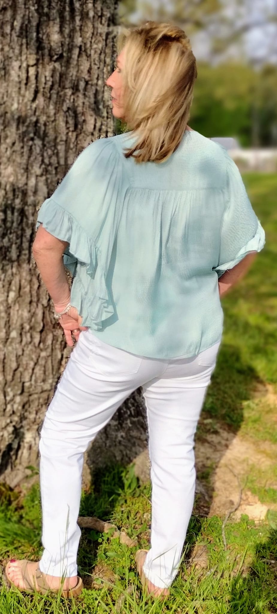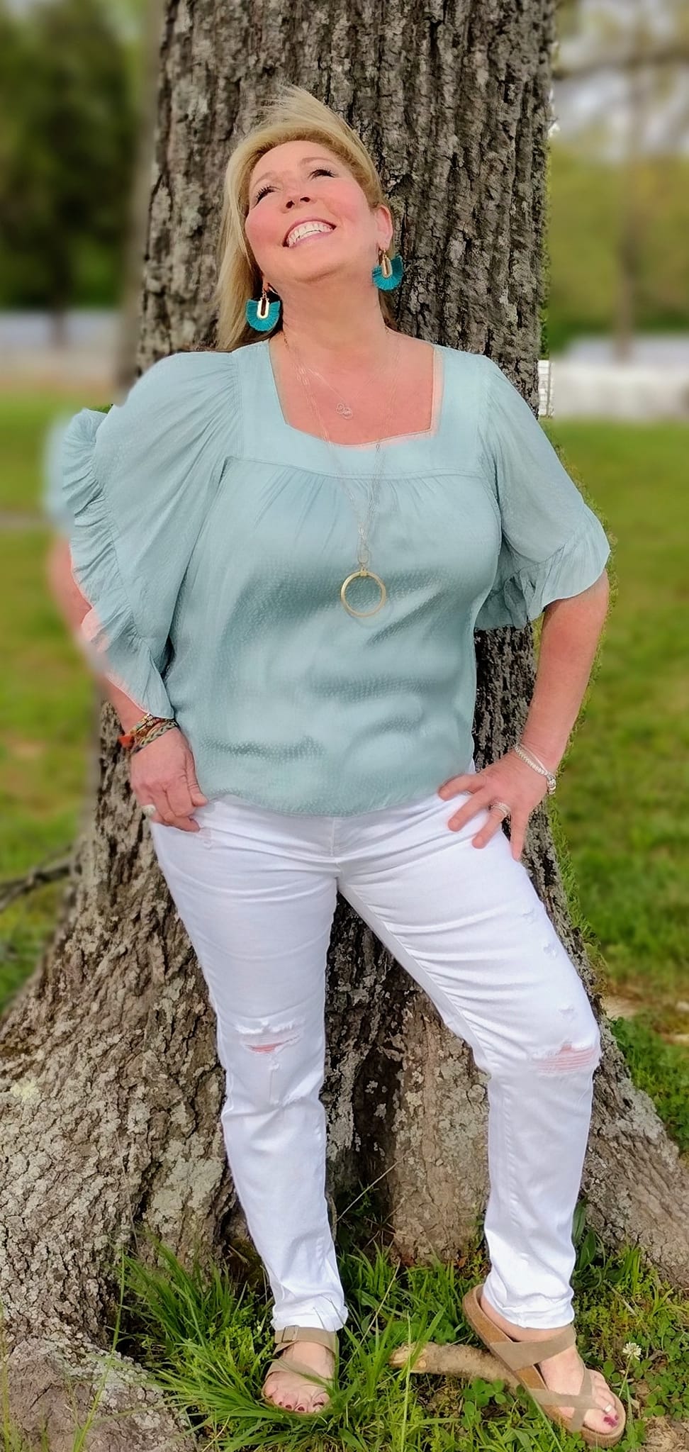 Satin Polka Dot Jacquard Ruffle Sleeve Blouse with Trendy Square Neck. This blouse is relaxed true to size fit.