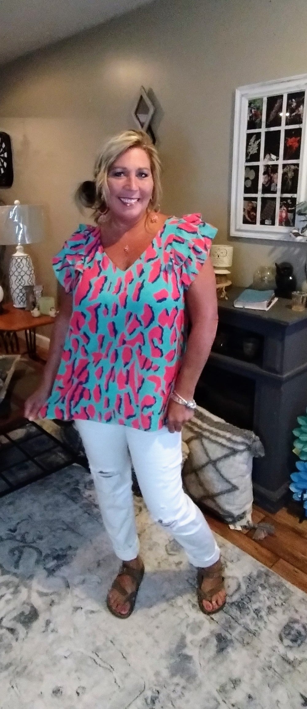 Summer Breeze Abstract Print V-Neck Top with Double Layer Ruffle Sleeves