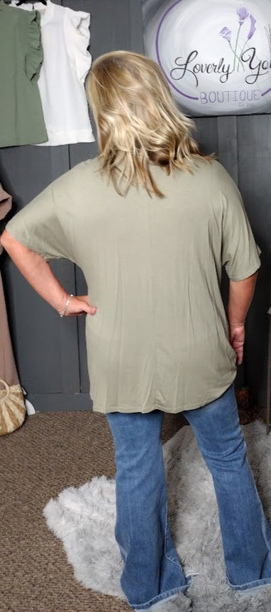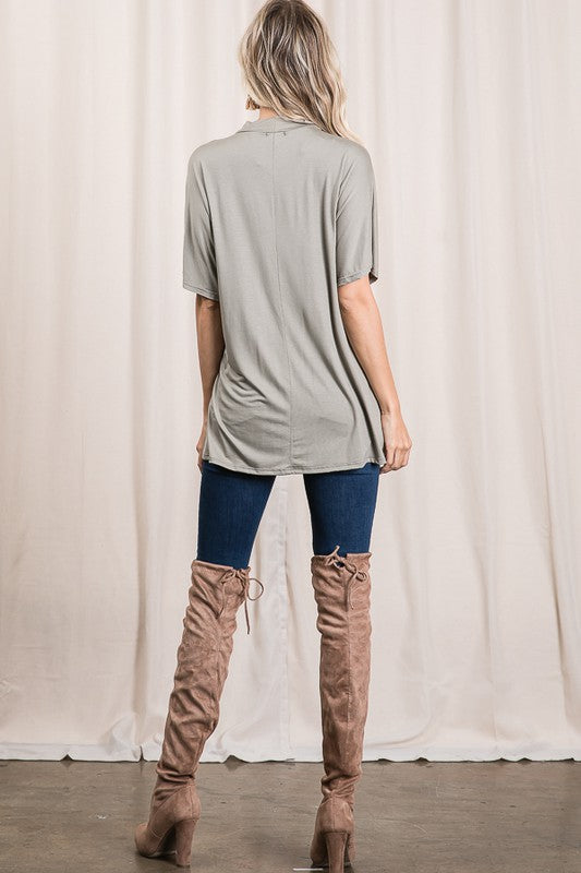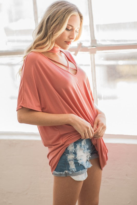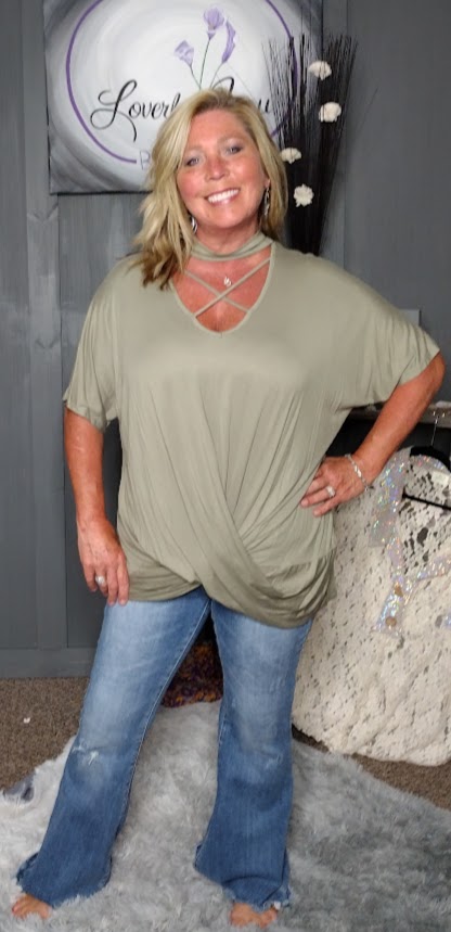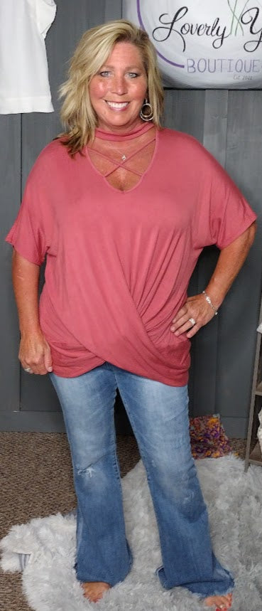 Extremely Soft and Comfy! Relaxed Fit. Solid rayon jersey front surplice top Front key hole with criss cross details